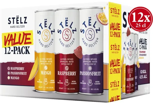| Description | STËLZ Hard Seltzer is bruiswater met een vleugje fruit en 4,5% alcohol. Geen suiker, geen koolhydraten, geen gluten en slechts 63 calorieën per 25cl blikje. |